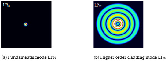 The C + L band is selected in the experiment; the center wavelength is around 1550 nm, and the lengths of the interference arms are 5 mm, 13 mm and 17 mm, respectively. Substituting each parameter into Equation (11), the refractive index difference Δneff between modes can be calculated to be 0.004910422 dB·s, 0.005295119 dB·s and 0.005034926 dB·s, respectively. The relationship between Δneff and different modes is analyzed by OptiFiber software, as shown in Table 1. By analyzing the effective refractive index difference between the higher-order mode and the fundamental mode, the experimentally obtained refractive index difference is closest to the difference between LP01 and LP07. Among them, LP01 is mainly transmitted in the core, and LP07 is mainly transmitted in the cladding. The optical mode distribution of the fiber-truncated surface of the fundamental mode LP01 and high-order LP07 mode given by software simulation is shown in Figure 6.