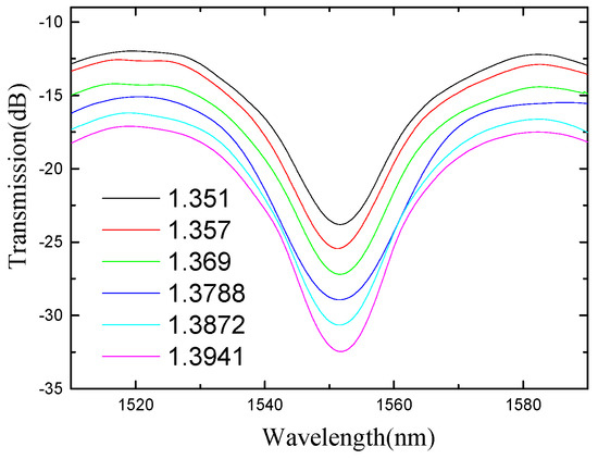 The corresponding relationship between the experimentally measured sensitivity coefficient of each parameter and each parameter of the matrix equation is as follows: KnP = −191.06 dB/RIU, Knλ = −5.09 nm/°C, KTP = −0.003 dB/RIU, KTλ = 0.12 nm/°C. Substituting the measurement data into Equation (13), Equation (14) can be obtained. Through the analysis of the spectrum, the changes of the refractive index and temperature value of the detection environment can be obtained based on Equation (14).