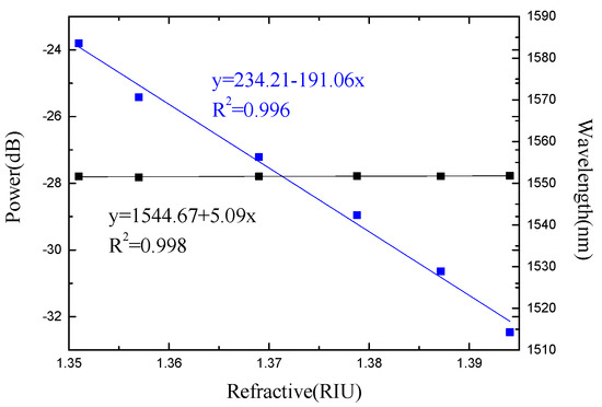 As the refractive index of the liquid increases, the intensity and wavelength of the spectral valleys change accordingly, as shown in Figure 8. The blue dots are the measured intensity data, and the black dots are the measured wavelength data. The fitted line is obtained by the least squares fitting method. A linear decrease in the power of the trough can be observed. With the refractive index changes from 1.351 RIU to 1.4027 RIU, an intensity response sensitivity of −191.06 dB/RIU and a wavelength response sensitivity of 5.09 nm/RIU are obtained, as shown in Figure 9.