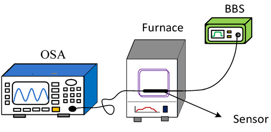 The schematic diagram of the temperature experimental device is shown in Figure 10. The light emitted by the ASE light source is transmitted into the sensor, and the MS740A spectrometer (Anritsu, MS9740A, Kanagawa, Japan) is used to measure the reflection spectrum of the sensing system. The temperature control system is a high-temperature muffle furnace (Omega, Biel/Bienne, Switzerland), and the temperature control accuracy is 1 °C. As the temperature increases, the spectrum of the fiber Michelson shifts due to the thermo-optic and thermal expansion effects, as shown in Figure 11. It can be seen from the figure that the sensor is sensitive to temperature changes and can be designed as a temperature sensor.