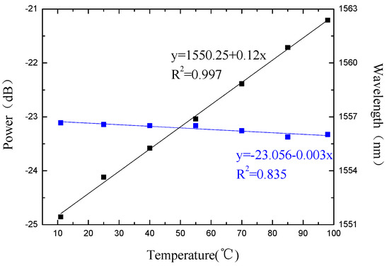 Equation (7) characterizes the change in wavelength with temperature. The thermal expansion coefficient and the thermo-optic coefficient are constants. Therefore, it can be drawn theoretically that when the monitoring wavelength is constant, the temperature response sensitivity is a constant; in other words, the change of wavelength is approximately linear with the change of temperature, which can be confirmed by the following temperature experiments.