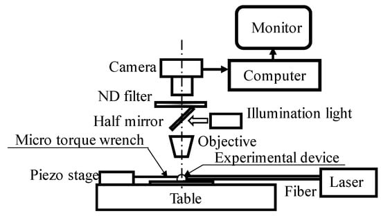 In the friction-reduction experiment, friction reduction with and without the light radiation pressure was observed using an observation device, as outlined in Figure 4. The friction-reduction confirmation mechanism was fixed on the table. The light was introduced from the upper and lower light inlets using a fiber (Lensed Tip Fiber Patch Cable; Thorlabs).