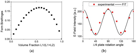 (a): Form birefringence vs. dielectric volume fraction calculated using Equations (1) and (2). (b): Plot of the E-field intensity of the manufactured λ/4 plate device under rotation around the THz beam propagation axis, with 15° steps. The solid curve represents the transmittance for an ideal λ/4 plate (see text).