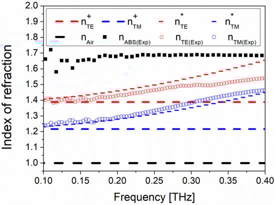 The birefringence calculated from both solutions is similar and well explains the experimental results. However, static solutions (Equations (1) and (2)) contain no information on the cut-off frequency since the extracted index of refraction is constant. Second-order EMT solutions (Equations (3) and (4)) give instead an estimate of the cutoff limit of the designed birefringent system as the extracted index of refraction values reaches and exceeds the values of the ABS material. This behavior is more clearly observed with the experimentally extracted parameters where they deviate from the calculated values after around 0.3 THz (Figure 2).