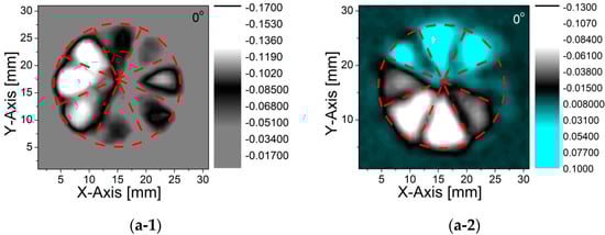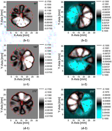 The slight distortion/deviation from the circularity of the patterns observed in the vectoral elaborations of the E-field patterns (Figure 5) was mainly caused by the mismatch in between the q-plate segments for which they do not perfectly coincide with each other in between the two measurement schemes (EX vs. EY detection). This is for the combined effect of the possible alignment uncertainties due to polarizers’ and antennas’ orientations, and the tilting of the q-plate. Moreover, the junction points in between each segment are relatively thick due to the limitations of the printer utilized, which lead to a slight distortion of the electromagnetic field orientations at the intersection points. This can be reduced by using a higher-precision printer and/or modifying the printer by using a smaller nozzle size.