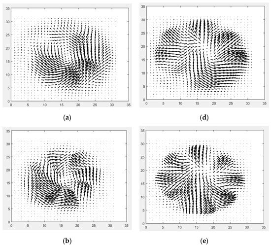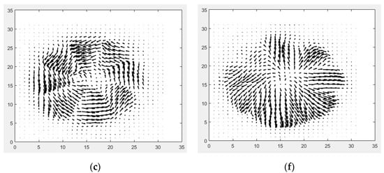 The information on the field vectors was retrieved by combining the amplitude and the phase extracted from the FFT analysis. The corresponding vector fields (where are the unit vectors in x and y-directions, respectively) are presented in vector notation in Figure 5.