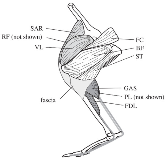 Kangaroos move at high speeds by using their hind legs to jump instead of run, demonstrating the strongest jumping performance of any mammal. Adult kangaroos can jump up to 2 m at a low speed, and at a high speed they can jump a horizontal distance of up to 6~7 m, with a jump speed of up to 60 km/h and a vertical jump height of up to 4 m. The jumping power of a kangaroo is mainly provided by the hind limbs. By dissecting 52 adult kangaroos, Hopwood [24] found that the thigh length accounted for 23% of the total length of the leg, the calf length accounted for 46%, and the foot accounted for 31%. The main muscles of the hind limbs of a kangaroo are shown in Figure 1 [25,26]. The hip extensors include the biceps femoris (BF), the femorococcygeus (FC), and the semitendinosus (ST); the knee extensor muscles include the vastus lateralis (VL), the rectus femoris (RF), and the sartorius (SAR); and the ankle extensor muscles include the medial and lateral heads of the gastrocnemius (GAS), the plantaris (PL), and the flexor digitorum longus (FDL).