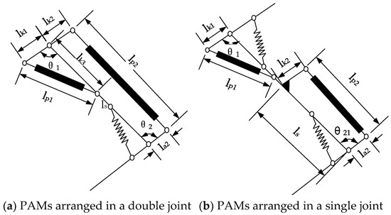 For comparison, both joints were constructed with the same parameters, and the pneumatic artificial muscle was arranged in a single joint. The mechanism diagram is shown in Figure 3b. The knee angle was the same as in Equation (1), and the ankle joint angle was: