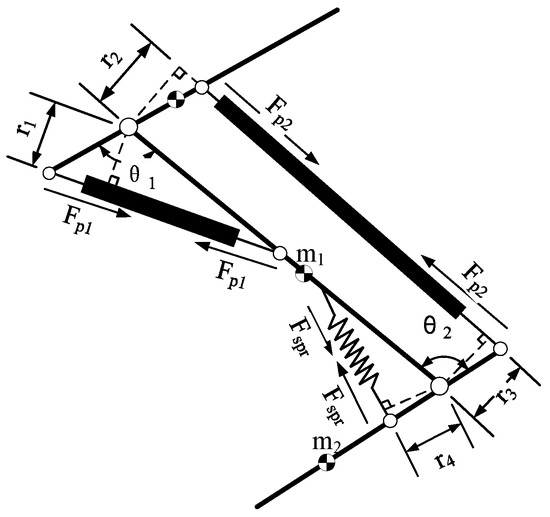 A sketch of the bionic legs driven by PAMs is shown in Figure 3: is the length of the tibial connecting rod; represent the distance between the joints and the PAMs; represent the total length of the pneumatic muscles and connectors; and represent the angles of the knee and ankle, respectively.