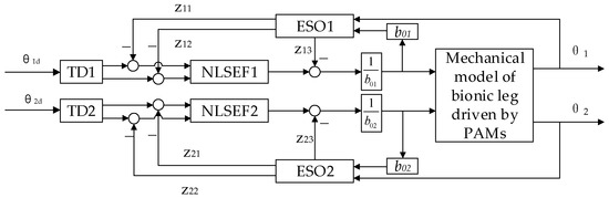 The position control system of the bi-joint bionic leg with ADRC is shown in Figure 5. In the ADRC process, the part outside the system control input is regarded as the “dynamic coupling” section, and the model error and external disturbances are regarded as system disturbances. Real-time observation and compensation are carried out through the extended state observer, so that the bionic leg joint coupling system is transformed into two independent joint control systems.