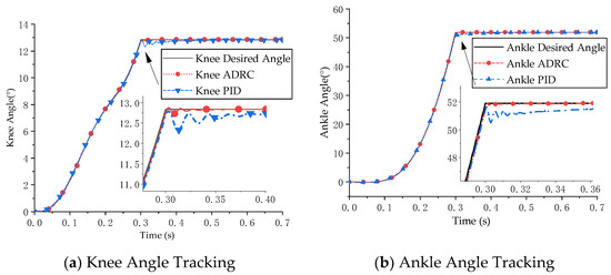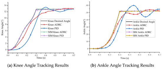 A 3D model of the bionic leg was established in ADAMS software, and the controller was built using Simulink to simulate the tracking and control of the knee and ankle joint angles. The ADAMS–MATLAB co-simulation model was constructed using the co-simulation plug-in and is shown in Figure 6. ADRC and PID control were used to track the angle of the bionic leg joint, and the effects of the two control algorithms were studied.