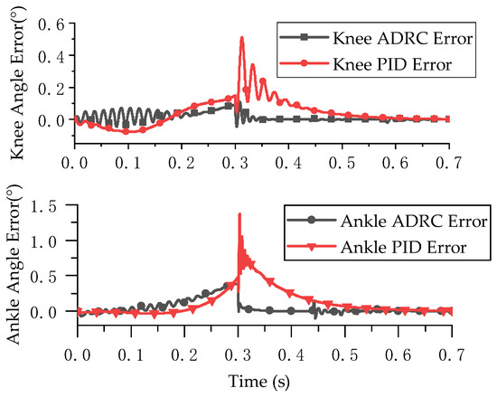 As can be seen from the angle tracking experiment, due to the equipment responses and the hysteresis and creep of the pneumatic artificial muscles, the tracking performance had a certain degree of error, and the above problems were not considered in the simulation. There was a strong tremor when switching from the take-off phase to a constant joint angle. The maximum error amplitudes of the knee joint and ankle joint angles with ADRC were 2.64° and 12.46°. The maximum tracking errors of the PID control algorithm for the knee joint and ankle joint angles were 5.14° and 20.23°. The stability time for ADRC was 0.544 s, and the stability time for the PID control algorithm was 0.83 s. The experimental results show that the ADRC decoupling control of the double-joint bionic leg position was faster and more effective than the PID control algorithm.