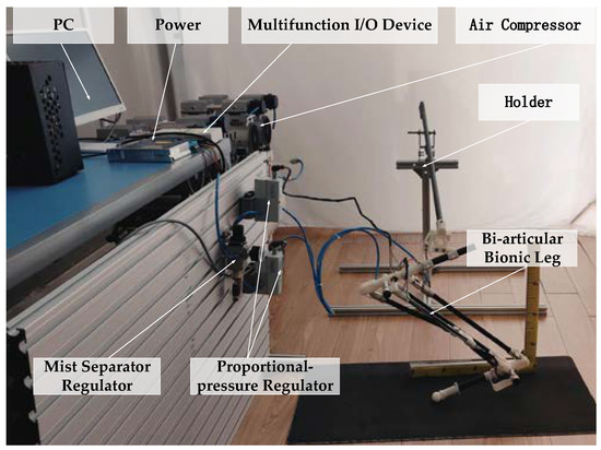 The experimental system is shown in Figure 9. The experimental system included an air compressor; a mist separator regulator (AWM20-02BCG); a proportional pressure regulator (Festo VPPM-10L-L-1-G18-0L10H); a biarticular bionic leg model driven by PAMs (Festo pneumatic artificial muscles with lengths of 280 mm and 160 mm); and a multifunctional I/O device (NI USB-6212). The bionic leg was composed of 3D-printing resin and a carbon-fiber tube. The controller was designed using MATLAB/Simulink. The multifunctional I/O device collected the voltage signal of the angle sensor in real time, and the proportional pressure regulator controlled the output pressure of the PAMs.
