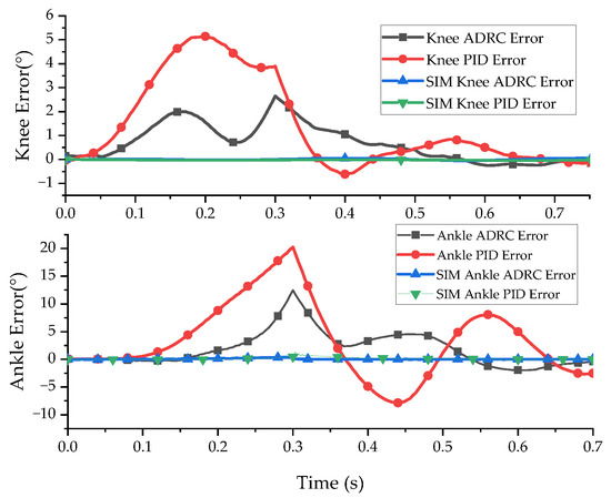The simulation results show that ADRC and PID control are highly effective for double-joint angle control. The control accuracy of the ADRC decoupling control algorithm for the knee joint and ankle joint was 0.10° and 0.38° and the control accuracy of PID control for the knee joint and ankle joint was 0.51° and 1.37°, respectively. The ADRC decoupling algorithm had a better decoupling effect.