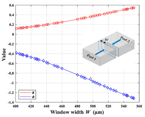 - We use the Ansys® High-Frequency Structure Simulator (HFSS) to simulate each iris window. The ports are de-embedded to both sides of the iris. From the simulated S parameters, we can obtain Xs and Xp, and then determine the impedance inverter value K. Every iris thickness is set to 100 μm. We adjust the window width W so that the simulated K value at the central frequency becomes close to the designed value in step (2). The relation between the inverter value K, the electric length ϕ, and the window width W is shown in Figure 2, which also illustrates the importance of the fabrication accuracy.