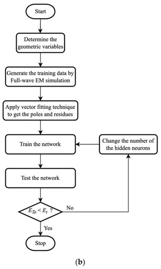 In the typical microwave design procedure, the geometries are first obtained by analytical methods and further optimized by numerical modeling to achieve the target response. In recent years, artificial neural networks (ANN) have been widely applied to speed up or to optimize the design process. As a common approach, ANN may take the device geometries as inputs and gives the S parameters as outputs, mimicking the electromagnetic simulation process [9,10]. Once the neural networks are developed, the computation time becomes much faster than the electromagnetic simulator, therefore, it is particularly suitable for designing and optimizing microwave component designs. In addition, ANN can also be used to solve the inverse design problem; the inputs are the desired frequency response and the outputs are the geometries of the microwave component [11,12].