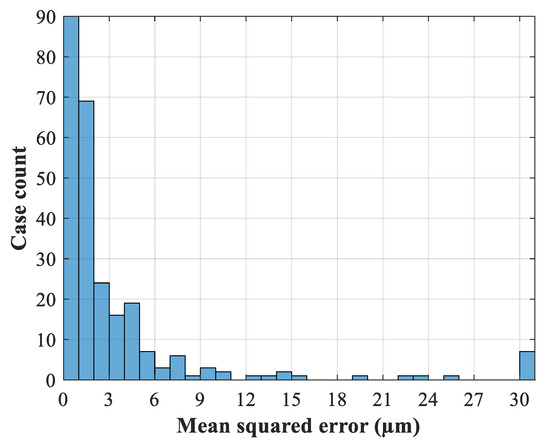 The data used for developing the artificial neural network is generated by HFSS simulations, and we apply the design of experiments [19] approach to generate the proper data. The number of samples and the ranges of the training data and test data are defined in Table 2. The flowchart in Figure 4 illustrates the overall process of the network model. The testing error ETe is defined as the mean squared error of all geometrical variables between the ANN modeling output and the testing data. If the testing error is lower than the error threshold Et, the process terminates and the network model is ready to use. The final number of neurons in the hidden layer after the training process is 40. Figure 5 shows the histogram of 256 test samples. The horizontal axis represents the mean squared error of the dimension parameters. As can be seen from the figure, there are 216 cases with an error less than 5 μm, close to the fabrication error of the CNC process.