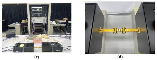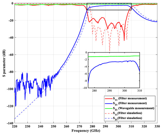We measured the proposed filter at Taiwan Semiconductor Research Institute (TSRI) and the whole measurement environment is shown in Figure 7. The measurement was carried out by a vector network analyzer (Keysight N5242B PNA-X, Santa Rosa, CA, USA), a millimeter-wave controller (Keysight N5262A, Santa Rosa, CA, USA), and two millimeter-wave frequency extenders (Virginia Diodes Inc., Charlottesville, VA, USA). We used the calibration kit (Virginia Diodes Inc., Charlottesville, VA, USA) to perform the Through-Reflect-Line calibration. As shown in Figure 6, the measurement result indicates that the center frequency is 292.28 GHz and the fractional bandwidth is 11.64% from 276 GHz to 310 GHz. The in-band insertion loss is about 3 dB for a 22 mm long waveguide filter and the return loss is better than 17 dB. We also measured a 22 mm long straight waveguide without filter structures for comparison. The insertion loss of the straight waveguide is about 0.91 dB. The performance comparison between the proposed waveguide bandpass filter and other references are summarized in Table 3.