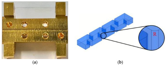 The parameters obtained from the coupling matrix synthesis or the artificial neural network do not yet meet the filter requirement (|S11| > 25 dB in the passband). We set those parameters as the starting point and optimize the filter response using the HFSS software. The optimized dimensions of the filter are summarized in Table 1 and the simulated filter response is shown in Figure 6. A fillet of radius R = 75 μm is added to the edge of the iris to adapt to the requirement of CNC milling fabrication. In order to avoid misalignment, all geometric structures are machined in one of two metal blocks while the surface of the other metal block is kept flat, as shown in Figure 7.