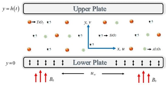 The ternary hybrid nanofluid flow across two parallel infinite plates, consisting of titanium dioxide, silicon dioxide, and aluminum oxide is reported. The flow mechanism is graphically depicted in Figure 1. The upper plate is located at , which fluctuates downwards with the velocity . The lower plate is permeable, which allows suction/injection effect, signified as Both plates are assumed at constant temperatures T1 and T2. The lower plate is expanding with the linear velocity Furthermore, the time-dependent magnetic field is characterized as . The basic flow equations are communicated as [47,48,49]: