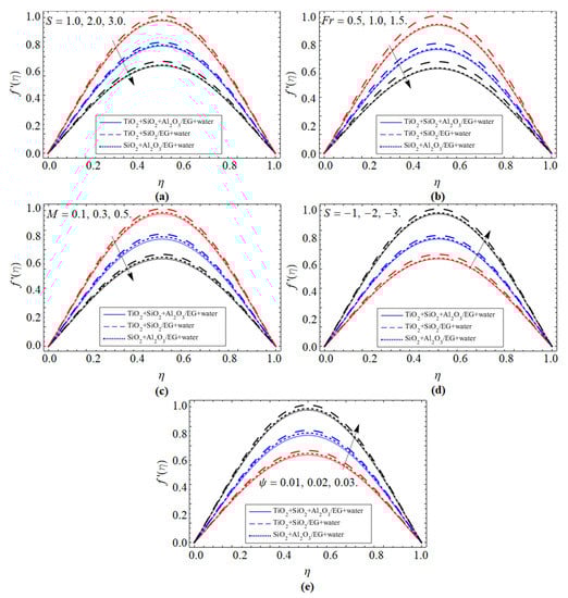 The tendency of velocity profile (f′(η)) versus (a) suction term S > 0, (b) Darcy–Forchheimer Fr, (c) magnetic field M, (d) injection S < 0, and (e) volume friction of ternary nanoparticles .