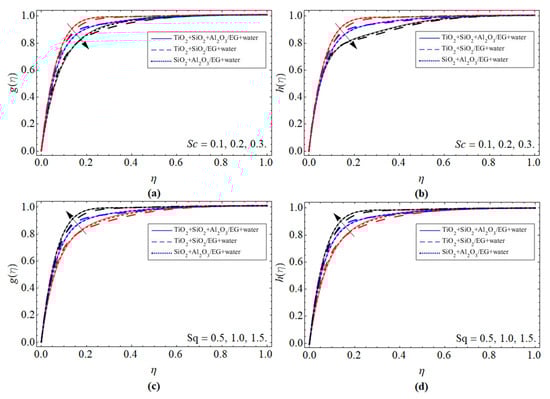 Figure 3a–d report the presentation of the electric field (g(η), h(η)) profile versus the Schmidt number Sc, and squeezing term Sq, respectively. The kinetic viscosity of fluid enhances with the effect of the Schmidt number, which diminishes the molecular dissemination, and causes the lessening of the electric field (g(η), h(η)), as shown in Figure 3a,b. The influence of the squeezing variable fluctuates the fluid particles, which enhances its velocity, and as a result, the electric profile is also boosted, as elaborated in Figure 3c,d.