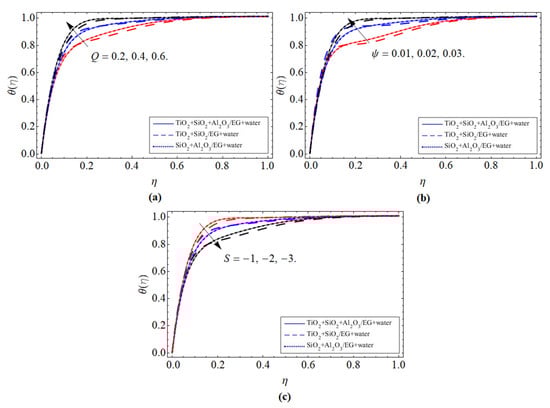Figure 4a–c represents the tendency of energy profile θ(η) versus the heat source Q, volume friction of ternary nanoparticles , and injection S < 0 constraints, respectively. As a consequence of the heat generation term, thermal energy is generated inside the fluid flow, which causes the elevation of the energy profile θ(η), as seen in Figure 4a. Figure 4b illustrates that the inclusion of nanomaterials (TiO2, SiO2, Al2O3) in the base fluid augments the thermal conduction of the base fluid, as well as reduces the average heat capacity, because the specific heat capacity of ethylene glycol/water is much higher than ternary nanoparticles. This is why the energy propagation rate of ternary nanofluid magnifies with the rising quantity in the concentration of nanoparticles . The energy transfer rate of ternary NFs declines with the upshot of the injection term, as shown in Figure 4c.