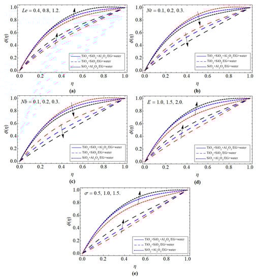 Figure 5a–e displays the trend of mass profile ϕ(η) versus Le, Nt, Nb, activation energy E, and chemical reaction rate σ, respectively. Figure 5a–c elaborates that the transfer rate boosts with the rising values of Lewis number, which remarkably declines with the upshot of Nt and Nb. Physically, the molecular diffusion rate reduces with the variation of Le, which results in the reduction in the concentration boundary layer, as seen in Figure 5a. Furthermore, we are interested in investigating the influence of Nb and Nt on the flow mechanism, as these are two important factors that govern nanofluid movement. Brownian motion is a haphazard motion occurring as a result of nanomaterials in a fluid flow. Brownian motion is more powerful in fluids with low viscosity and elevated heat, as well as in fluids with tiny particles. However, their effect reduces the mass proportion ratio, as manifested in Figure 5b,c. The increment in activation energy constraint E and chemical reaction term dramatically elevate the mass transmission ratio, as publicized in Figure 5d,e. The effect of both factors accelerates the kinetic energy inside the fluid, which encourages fluid particles to move fast; as a result, the concentration profile of ternary nanofluid enhances.