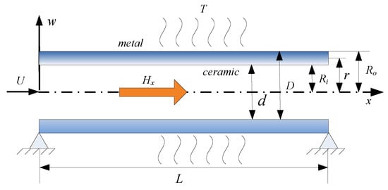 In the present study, the schematic of a functionally graded simply supported fluid-conveying microtube subjected to multiple physical fields is shown in Figure 1. In this schematic, the length of the microtube is , the velocity of the fluid is , the inner radius of the microtube is , the outer radius of the microtube is , the radius of the reference point is , the mass of a unit length of the microtube is , and the fluid mass of a unit length of the microtube is .