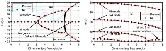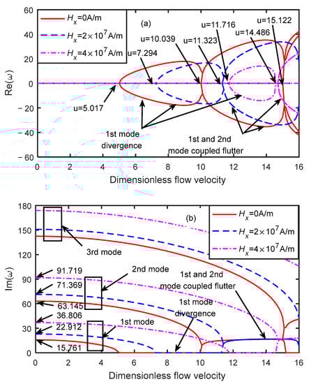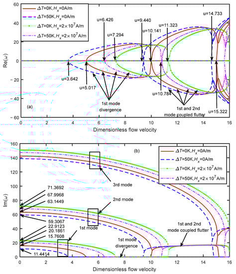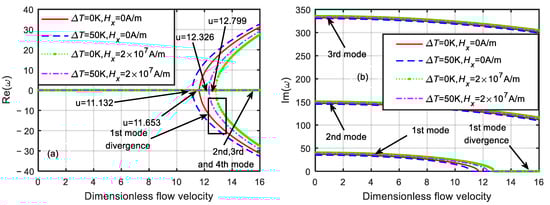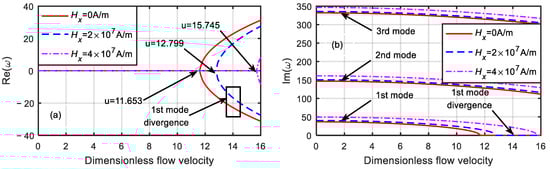 Dimensionless eigenfrequency variations with dimensionless flow velocity under different magnetic fields (). (a) Real part. (b) Imaginary part.