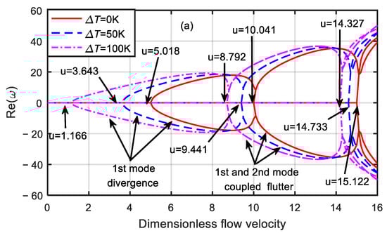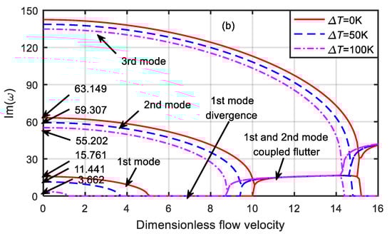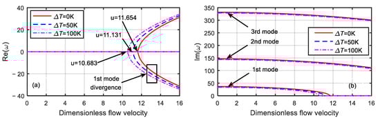 It can be seen from Figure 3 that with the increase in the dimensionless velocity, the frequency of the system gradually decreased. When the first-order frequency was zero, the first-order damping bifurcated, and the system diverged. The corresponding dimensionless flow velocity is called the critical velocity. The critical velocity of the system at the temperature differences of 100, 50, and 0 K were 10.683, 11.131, and 11.654, respectively. When the dimensionless flow velocity was zero, the corresponding first-order natural frequencies were 36.6088, 34.9673, and 33.2447, and the second-order natural frequencies were 146.8286, 145.2193, and 143.592, respectively.