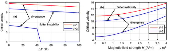 As shown in Figure 7, when and , the critical velocity of the microtube was . When and , the critical velocity of the microtube was . When and , the critical velocity of the microtube was . When and , the critical velocity of the microtube was . Owing to the opposite effects of the temperature difference and magnetic field, the critical velocity of the microtube in the coupled field was between those of the two single physical fields.