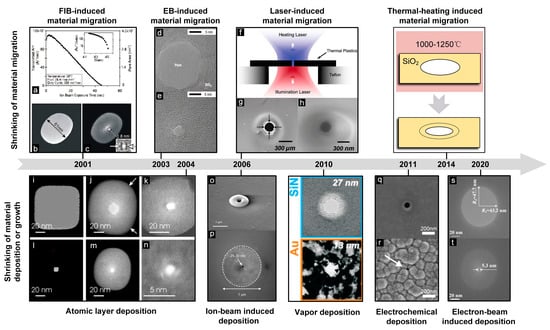 The timeline of typical shrinkage manufacturing technologies. Shrinking of original material migration: FIB-induced material migration [], (a) Transmitted ion count rate and pore area, (b) 61nm pore, (c) after ion beam exposure; EB-induced material migration [], (d) Before shrinking, (e) After shrinking; Laser-induced material migration [], (f) A schematic, (g) Before shrinking, (h) After shrinking; Thermal-heating induced material migration []. Shrinking of new material deposition or growth: Atomic layer deposition [], (i,k,m) Before shrinking, (j,l,n) After shrinking; Ion-beam induced deposition [], (o) Before shrinking, (p) After shrinking; Vapor deposition []; Electrochemical deposition [], (q) Before shrinking, (r) After shrinking; Electron-beam induced deposition [], (s) Before shrinking, (t) After shrinking.