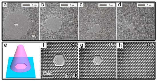 In 2003, the nanometer-scale modification was first realized in EB sculpting within TEM []. Beforehand, SiO2 nanopores with different initial sizes from closed pores to pores of about 200 nm were prepared by anisotropic KOH wet etching and thermal oxidation. Subsequently, taking advantages of TEM’s in situ imaging and direct feedback, the controllable shrinking process with a sub-nanometer accuracy has been entirely fulfilled by manipulating the electron-beam irradiation time under low electron intensity, which was ensuring the shrinking rate as lower as 0.3 nm/min []. Passing constant radiation, a shrinking nanopore was obtained in Dekker’s group from the initial diameter of about 6 nm to the final size of 2 nm only [], as shown in Figure 2a–d. Meanwhile, the corresponding principle of minimum surface free energy was proposed, as shown above, which was then widely validated in high-energy-beam-induced modification in TEM.