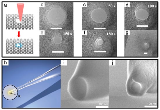 EB-induced material migration. (a) Scheme of the graphene nanopores shrinking under electron beam radiation. (b–g) Under the electron beam radiation of low current density, the continuous shrinking process of graphene nanopores. The scale bar is 15 nm []. (h) Scheme of the conical end of the nanocapillary. (i) SEM in-lens image of a quartz nanocapillary. (j) Shrunken nanocapillary after 14 min of irradiation under constant angle and beam parameters [].