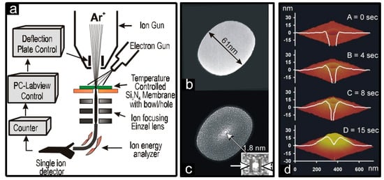 - Li, J.; Stein, D.; McMullan, C.; Branton, D.; Aziz, M.J.; Golovchenko, J.A. Ion-beam sculpting at nanometre length scales. Nature 2001, 412, 166–169. [Google Scholar] [CrossRef] [PubMed] [Green Version]
