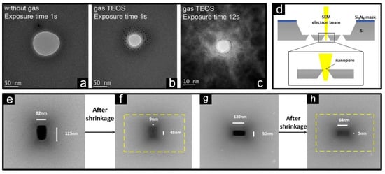 Shrinkage of material deposition or growth. (a–c) TEM images of nanopores fabricated by Ion-beam induced deposition with and without Si(OC2H5)4 (TEOS) gas for different exposure times []. (d) Schematic diagram of election-beam induced deposition. A nanopore before (e,g) and after (f,h) the EBID process [].