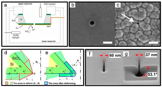 (a) Schematic diagram of electrochemical deposition. SEM images before (b) and after (c) electrodeposition (scale bar: 200 nm) []. (d,e) Schematic diagrams of the nanopore shrinkage induced by thermal oxidation: (d) growth of a SiO2 layer; (e) deformation of the SiO2 layer. (f,g) The inner structure of a nanopore before (f) and after (g) shrinkage [].