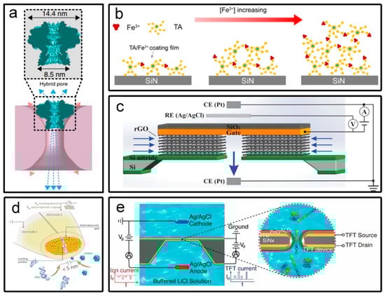 Recent solutions for small-size nanopore fabrication. (a) Cartoon image of the hybrid nanopore []. (b) Schematic diagram describing that the thickness of the coated TA/Fe3+ membrane is controlled by the concentration of the Fe3+ []. (c) Schematic of our atomic-scale graphene channel device with electric potential control using a three electrode configuration []. (d) Conceptual design of the quantum mechanical tunnelling probe []. (e) Schematic of a thin-film transistor−nanopore device and translocation experiment setup that concurrently measure both ionic and thin-film transistors signals [].