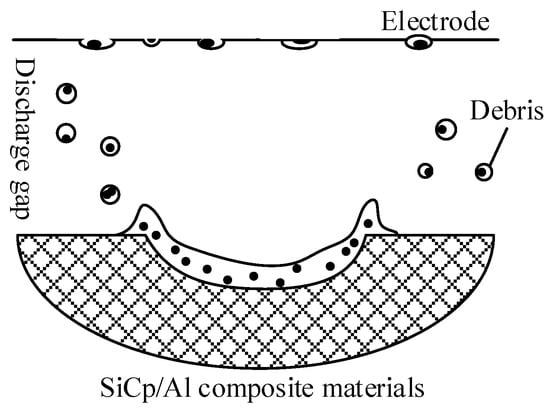 The residual stresses are generated near the surface of the pit on both the tool and the workpiece, which mainly come from two aspects. Firstly, the heat source is the most critical factor affecting residual stress of discharge. The heat sources in EDM come from the discharge channels generated between the electrodes. When the heat source acts on the surface of the two electrodes, the heat on the surface of the tool and the workpiece promotes the melting and vaporization of the material by consuming its energy. In this process, a small amount of heat is still transferred to the tool and the workpiece. At this point, the physical properties of the material, such as the coefficient of expansion, will cause the material to expand and generate thermal stress [8]. For particle reinforced metal matrix composites, the coefficient of thermal expansion of matrix is different from that of particle. As the temperature rises, the internal stresses are released. Due to the difference in thermal expansion coefficient between the matrix material and the particles, the expansion of the matrix is much larger than that of the particles. In the expansion process, the matrix and the particles will inhibit each other and generate compressive stress, respectively. To relieve the stress, local microplastic deformation occurs in the material, and the stress below the yield strength is retained inside the workpiece as residual thermal stress [9,10].