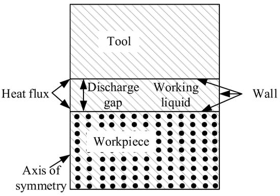 Figure 3 is the boundary conditions in the melting simulation model. The flow field geometric model was a rectangle with the length and height of 300 μm and 330 μm, respectively. The geometry models of tool, workpiece, and discharge channel were established in the flow field. The tool and workpiece were rectangular with a height of 100 μm, and the discharge channel height was 30 μm. To improve the calculation efficiency, a two-dimensional axisymmetric model was adopted in the simulation, and the left side of the flow field was set as the axisymmetric. Interface thermal resistance was selected for the contact surface between matrix and particles. The upper and lower sides and the right side of the flow field were set as walls. The materials and machining parameters are listed in Table 1. The tool was red copper, the workpiece was SiCp/Al, and the deionized water was used in the working liquid. DEFINE_PROFILE module was used to load the Gaussian heat flux function onto the tool and workpiece surfaces. The melting and solidification model was selected to simulate the melting and phase transition process of the material surface. The pulse-on was 20 μs in the simulation for single discharge in EDM. Because the simulation research focuses on the material surface temperature and the formation of the molten pool, the discharge area was finely meshed [13,14] in the mesh section, and the other area was coarsely meshed. The meshed model is shown in Figure 4. The generated mesh file was imported into Fluent software, boundary conditions and material properties were set, and after the simulation, the changes of the surface temperature and molten pool with time were observed.