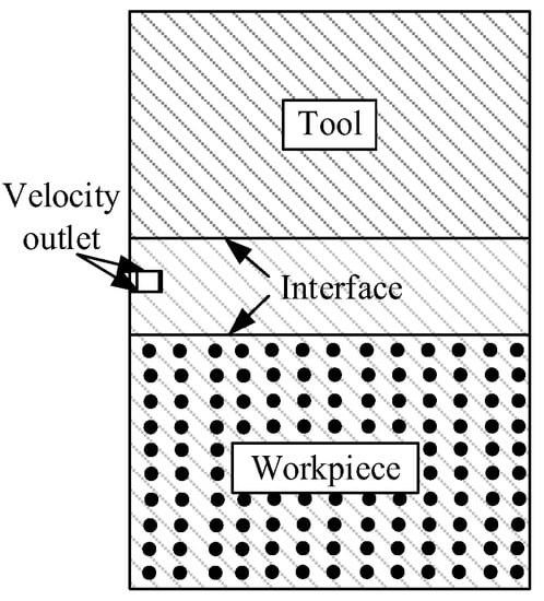 The material throwing simulation was obtained by modifying boundary conditions based on melting results. The boundary between the lower surface of the tool and the upper surface of the workpiece was modified to interface, and the upper and lower surfaces of the discharge channel were set as velocity outlets. The boundary conditions in the throwing simulation model are shown in Figure 5.