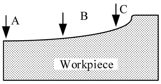 The main reason for crack propagation in Figure 17b,c is that extremely high temperature is generated instantly on the tool and workpiece surface during EDM, and the temperature decreases rapidly after discharge, which causes the material to expand and contract in a short period and be subjected to the thermal shock of this cycle. Thermal stress and thermal fatigue occur inside the material. Due to defects such as pores, impurities and microcracks, the stress concentration at the microcrack tip easily results in the formation of macroscopic cracks when subjected to thermal impact. In the simulation, the tip stresses at position B and position C on the surface of the pit are larger. In the experiment, large cracks appear at position B and position C, indicating that a large residual stress is generated inside the pit and is greater than the yield strength of the material, resulting in microscopic plastic deformation in the material. The crack location and size in the experiment can indirectly verify the distribution of residual stress obtained in the simulation, which verifies the correctness of the simulation results.