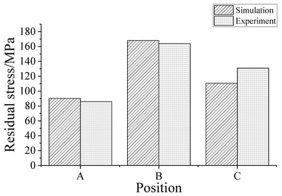 In the experiment, the X-ray diffractometer can only measure the surface of the workpiece. Proto LXRD 3000 was used to measure the residual stress of the three points A, B, and C. The maximum stress exists on Position B, which is 164 MPa. The second largest stress is on position C, 131 MPa. The minimum stress is 86 MPa, which is on position A. The largest stress normally appears at the crack tip. In the simulation, a small area for each position is selected, and the average value is calculated. The simulation result at position A is 90.25 MPa, the result at position B is 168.06 MPa, and the result at position C is 110.63 MPa. The results are close to those results in literature [6,7]. Compared with the simulation results, the experimental results are similar to the simulation results and verify the distribution of the cracks on the surface of the pit. The simulation and experimental results are shown in Figure 18.