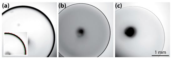 The width of the dark ring (w) was measured as follows. First, the inner and outer perimeter of the dark ring was identified by image processing in a similar way as described in Section 2.4. Second, circles were fitted against the perimeter using Kasa’s method. As shown in the inset of Figure 1a, the fitted circles agreed well with the identified perimeters. Last, the difference in the radius between the circles was determined as the width of the dark annuls. Using this approach, w was measured to be 103 µm, 37 µm, and 9 µm for concentrations of 18%, 67%, and 82%, respectively.