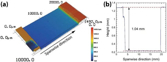 When the two layers were put together, they formed a Hele-Shaw cell of the desired gap height (h = 1 mm). The gap height of the Hele-Shaw cell was confirmed by imaging the bottom surface of the PDMS channel layer, which would face the PDMS layer of the glass plate, using a laser scanning confocal microscope (VK-X200, Keyence), as shown in Figure 2a. The tilting angle of the obtained surface image was corrected using the three-point method. The h of the Hele-Shaw cell was measured by finding the height difference between the bottom and top surfaces of the channel. As shown in Figure 2b, h was measured to be 1.04 mm, which was very close to the desired value (=1 mm).