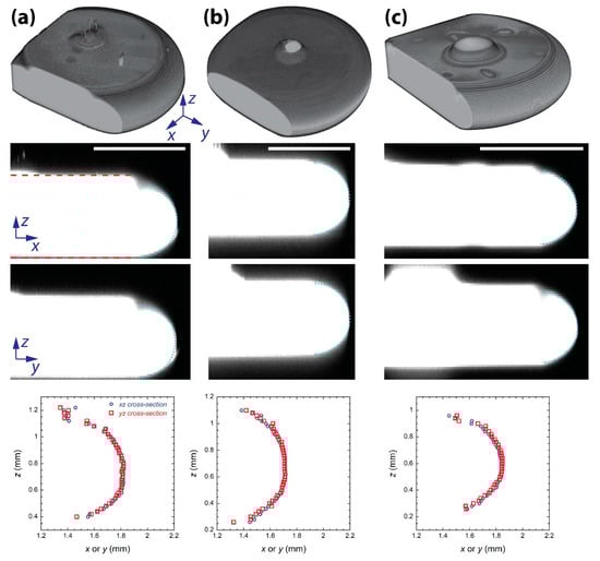The bottom row of Figure 3 shows that the meniscus profiles of the drop were similar between the two cross-sections. This agreement, along with the negligible difference in the drop thickness between the cross-sections, supports that the drop was axisymmetric. In these graphs, the x- or y-coordinate values were found with respect to the axis of symmetry of the drop. Thus, the maximum of these coordinates corresponds to the radius of the drop, which agrees well with the drop diameter shown in Figure 1. In contrast, the z-coordinate values were found with respect to an arbitrary reference. As such, the graphs were plotted so that the range of the horizontal and vertical axis would be 1 mm, which corresponds to the gap height of the Hele-Shaw cell. It should be noted that the difference in the z-values between the highest and lowest points was smaller than 1 mm.
