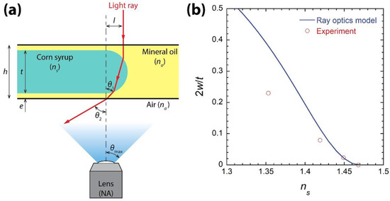 In this model, the meniscus of the drop is assumed to be a semi-circle with a radius of the half thickness of the drop (=t/2). Parallel light rays are formed by the condenser of the microscope, and one of them is shown in Figure 4a. The distance between the shown light ray and the center of the circular meniscus is l. As this light ray passes through the meniscus, it is refracted two times, as illustrated in Figure 4a. The incidence angle of the shown light ray into the bottom of the Hele-Shaw cell can be assumed as follows [25]: