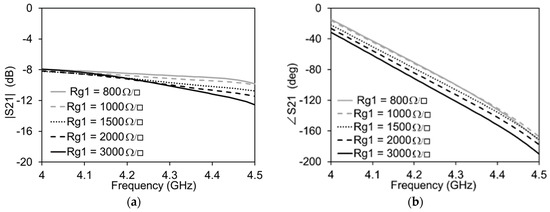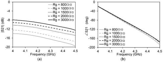 The maximum and minimum values of the graphene resistance are expected to be 3000 Ω/□ and 800 Ω/□ respectively. It can be clearly seen in Figure 4 that, when the graphene resistance, Rg, pertaining to the attenuator side of the transmission line is varied, the impact on the amplitude is maximum and that on the phase is negligible. The high transmission losses are due to the increased number of vias, resulting in total reduced graphene resistance since all of the graphene pads are in parallel to each other. The contribution of the IDC to the total transmission is less than 1 dB. Similarly, as reported in Figure 5, when the graphene resistance, Rg1, pertaining to the phase shifter side of the transmission line is varied, there is a minimum variation of the amplitude of the signal on the transmission line and a maximum variation of the phase.
