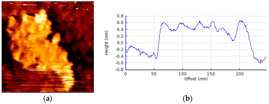 AFM characterization of a graphene flake: (a) AFM image with square a size of 250 nm; (b) cross-sectional measurement.